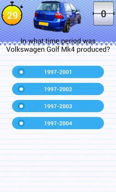 Получить эту викторину для Volkswagen Golf 4 вентилятора ASAP, если вы парень автомобиля, потому что вы будете иметь нагрузок весело играть в это! Играя в эту игру викторины лучший способ стать умнее и получать удовольствие в то же время!