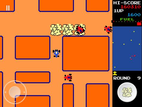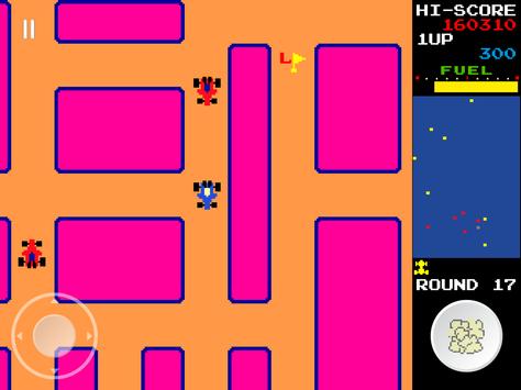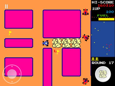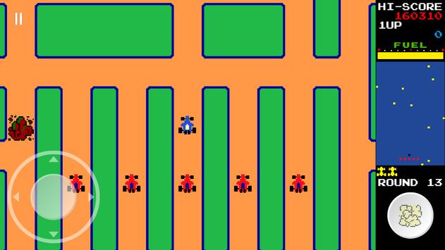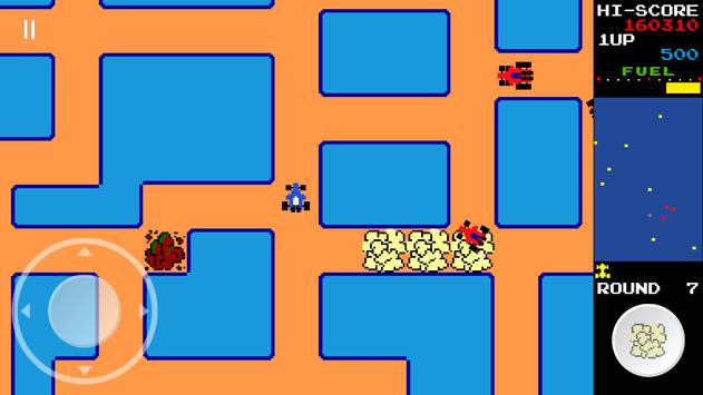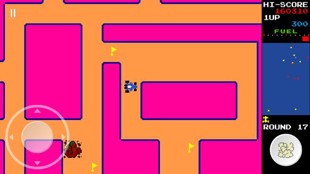 The player drives a blue car around a multi-directional, scrolling maze. The car automatically moves in whichever direction the joystick/d-pad is pressed, but if it runs into a wall, it will turn and continue. The player must collect all of the flags to clear the round and move on to the next round. The flags increase in value as they are collected: the first is 100 points, the second is 200, the third is 300, and so on. There are also special flags (indicated by red S) — if the player collects it, the value earned from flags doubles for the rest of the round. If the player dies, however, the double bonus is lost. The player will also obtain a fuel bonus after get the lucky flag(indicated by red L) and after the round is complete, and it varies depending on how much fuel is remaining according to the fuel gauge.