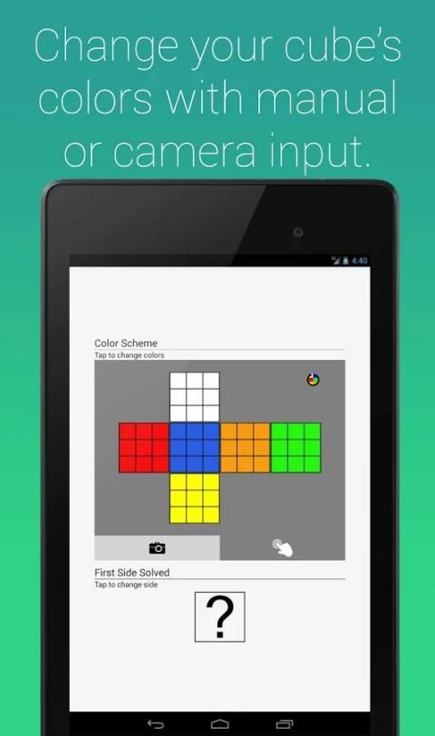 Вы можете использовать камеру телефона, чтобы сфотографировать человека куба, или просто положить цвета вручную, и это приложение будет решать ваши куб для вас. Вам просто нужно следовать инструкциям.
