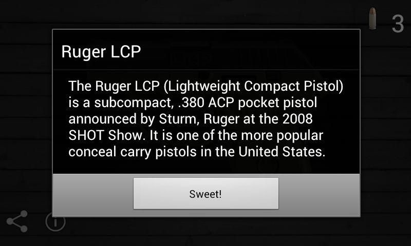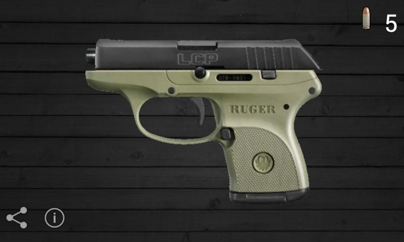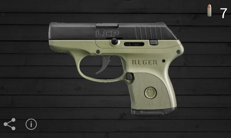 It's a fun, handy, and compact Ruger LCP simulation for your Android device! Tap the screen to fire, shake to reload. The Ruger LCP (Lightweight Compact Pistol) is a subcompact, .380 ACP pocket pistol announced by Sturm, Ruger at the 2008 SHOT Show. It is one of the more popular conceal carry pistols in the United States. But you don't need a conceal carry license for this app. Keep it with you at all times, and if somebody tried to mug you, they will be sorry they did!