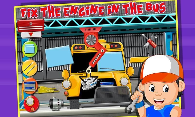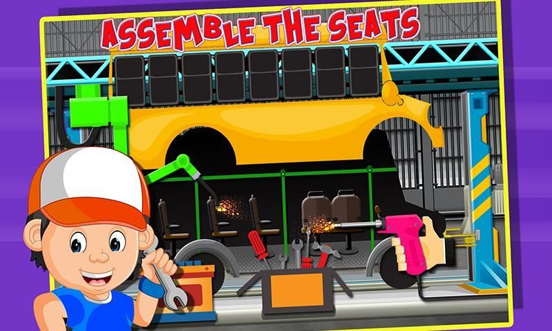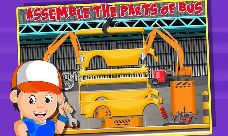 Школьный автобус завод дает огромное удовольствие маленьким игрокам, которые хотят изучить процесс проектирования и производства транспортных средств с простыми шагами. С меньшими усилиями и современной техникой, дети могут конструировать и украсить автомобиль в лучшем автобусе производитель игре. Маленький ремонтник автомобиль и механика получить готовые использовать свои навыки автомобиля строитель экспертов и профессиональных собрать школьный автобус. Не забудьте сделать желтую краску на автобусе с некоторой наклейкой и конструкцией детей любимых персонажей. Запишите слово школы на передней стороне автобуса для завершения процесса производства. Следуйте веселое пошаговые инструкции для создания специального школьного автобуса в этой захватывающей игре на заводе школьного автобуса. Просто выберите тело, выбрать детали, собрать структуру тела, исправить шины и краску с желтым цветом в гараже.