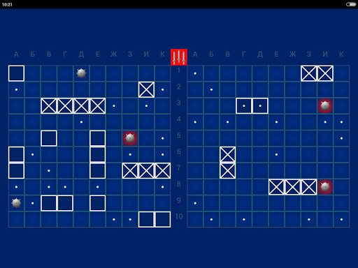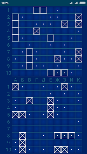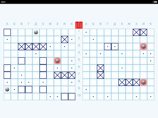Игровой экран приложения состоит из двух игровых полей – противника и вашего. Каждое из полей состоит из 100 клеток: 10 по горизонтали и 10 по вертикали. Для удобства клетки обозначаются по горизонтали буквами, а по вертикали – цифрами, например: А1, Е7, К10.