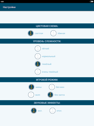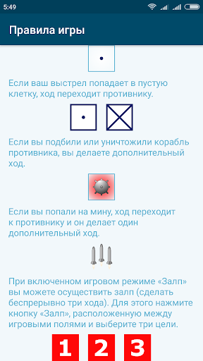 Вы можете играть в обычном режиме в общепринятый «Морской бой» с хорошо знакомыми нам всем с детства правилами. Либо дополнительно включить игровые режимы: «Мины», «Залп», которые позволяют применять в игре мины и произвести залп.