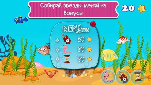 Эта игра-рыбалка для детей проста и увлекательна: ты используешь свой палец как рыболовный крючок, чтобы наловить как можно больше рыбы при помощи пузырей до тех пор, пока пузырьки или время уровня не закончатся. Но берегись акул и других морских хищников! Такую рыбу не захочешь увидеть на своем рыболовном крючке. Проводя время за увлекательной рыбалкой и собирая сокровища из сундука на дне океана, можно собирать звездочки и обменивать их на бонусы, которые помогут поймать еще больше рыбы в будущем.