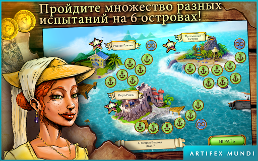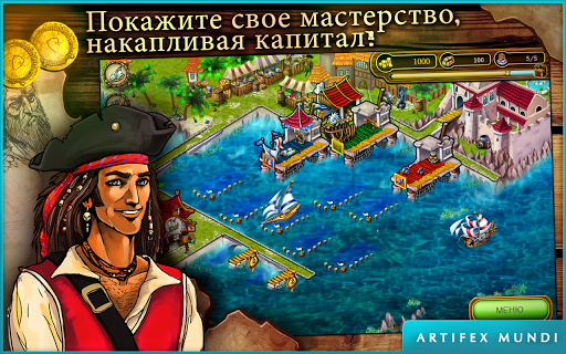 Возродите семейный бизнес и одержите победу над королем пиратов, чтобы спасти своего отца в игре жанра управления временем "Поднять паруса! Карибы"!