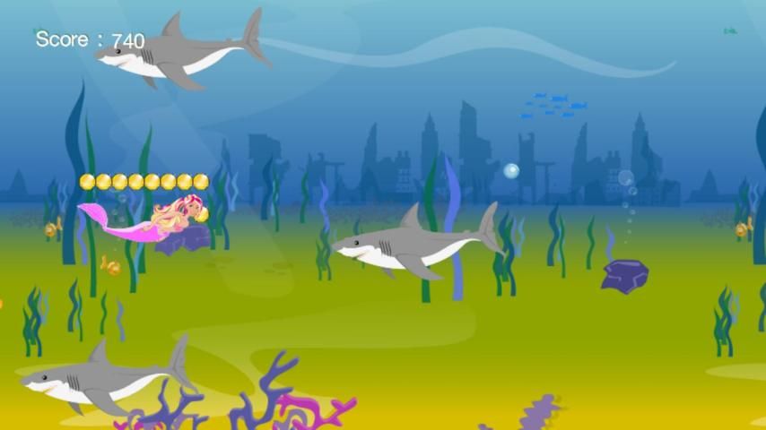 Прекрасный русалки Barbie хотел бы, чтобы избежать голодных акул атаки, но есть много препятствий.