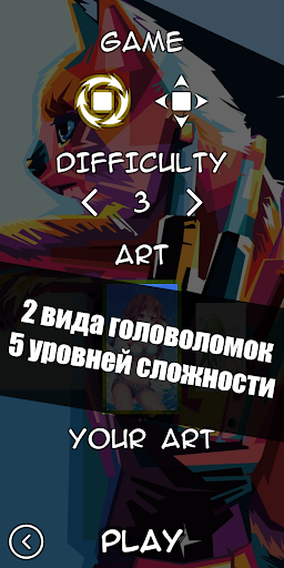 Собирайте пазлы, крутите и перемещайте блоки, чтобы восстановить картинку. В этой игре вас будет два различных типа головоломок с пазлами и 7 картинок для сборки. Головоломки имеют по 5 уровней сложности, что не даст заскучать даже самому опытному игроку! А возможность сделать головоломку из вашей картинки, позволит вам собрать пазл из ваших любимых персонажей, и подарит вам много приятных эмоций!