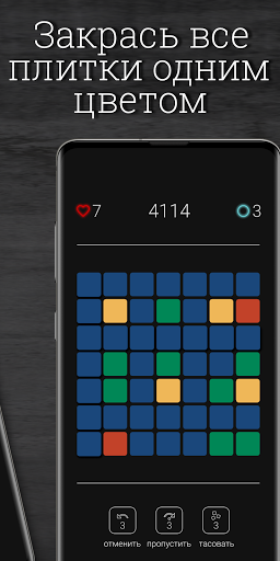 Каждый уровень разработан для того, чтобы прокачать те или иные навыки вашего мышления в игровой увлекательной форме. Для завершения уровня, необходимо перекрасить все плитки в выбранный цвет, потратив ограниченное число ходов. Сложность каждого уровня идет по возрастанию, ваш результат оценивается количеством набранных очков.