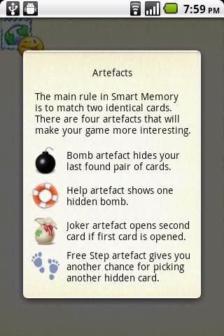 First memory game with hidden artefacts, where every artefact has a different meaning. Smart memory is very addictive and useful game for developing cognitive functions. It has three playing levels and five different card packs: * Animals * Fruits * Smileys * Flags * Funny Creatures * Nature * Fonts * Road Signs Enjoy.