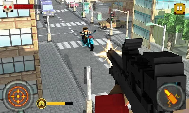 Стреляйте байкер беспокоящих человек. Убейте убегающих преступников. Помощь полицейских в подавлении преступников. Стрелять похититель сбор выкупа. Убейте коррумпированную леди торговца людьми.