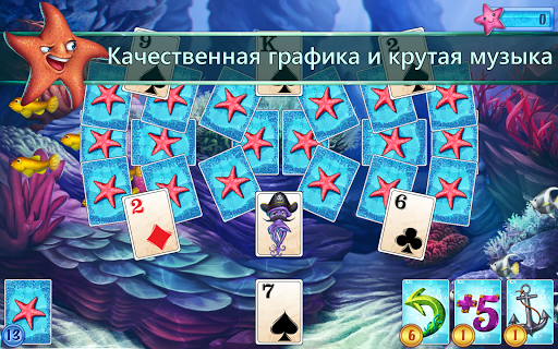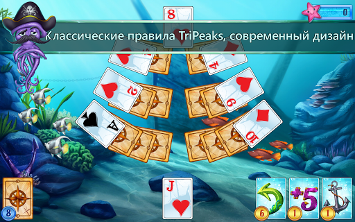 Исследуя пиратские карты и путешествуя по этому веселому приключенческому пасьянсу, вы сможете насладиться красочным подводным миром. Вам встретятся кальмар-пират, рыбы, дикий краб и даже морской конек-пират. Идеально подходит любителям приключенческих карточных игр, т. е. пиратам.