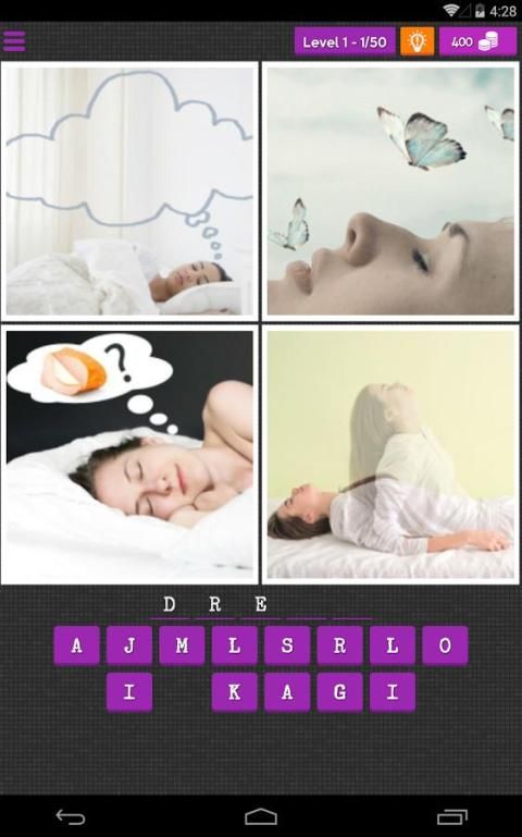Когда вы начинаете игру, вы увидите четыре изображения и пустое слово. Нажмите кнопки символов, чтобы заполнить пробелы.