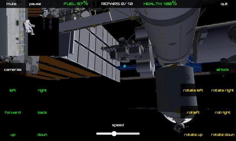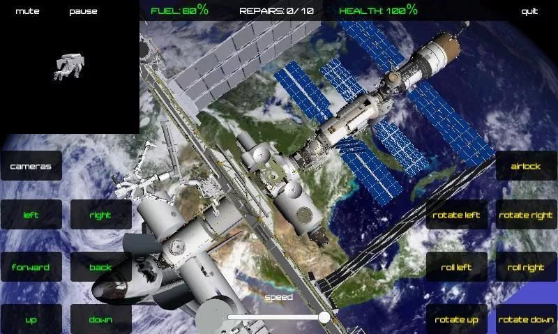 Этот тренажер ММУ оснащен 12 управления движением, контроль скорости и кнопка, которая автоматически укажет вам направление воздушного шлюза в чрезвычайной ситуации. Кроме того, каждый ремонт имеет свой собственный вид камеры, чтобы помочь вам найти его во время свободного полета плюс свой собственный вид из камеры, чтобы помочь вам избежать столкновений. Проверьте кнопку "камеры".