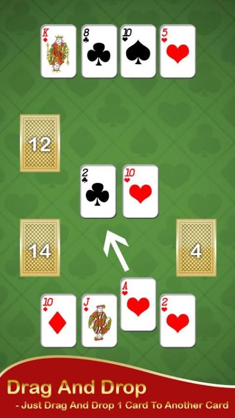 Нажмите свои карты, чтобы переместить их к центру сваи, если ранг один выше или ниже. Любая карта может пойти на джокера. Продолжайте идти, пока не закончатся карты.