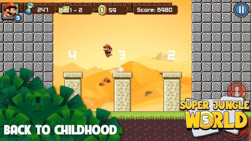 Супер Jungle Adventure бежит и прыгает на разных платформах и на вершине врагов в тематических уровнях.