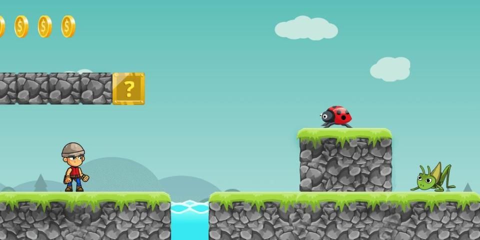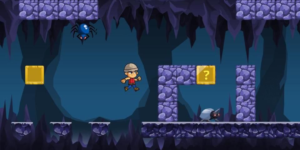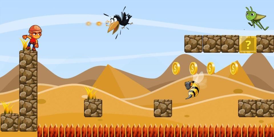 Классические джунгли платформер работает игра для детей и взрослых. Перейти кран и убивать монстров и спасти себя от ловушек.