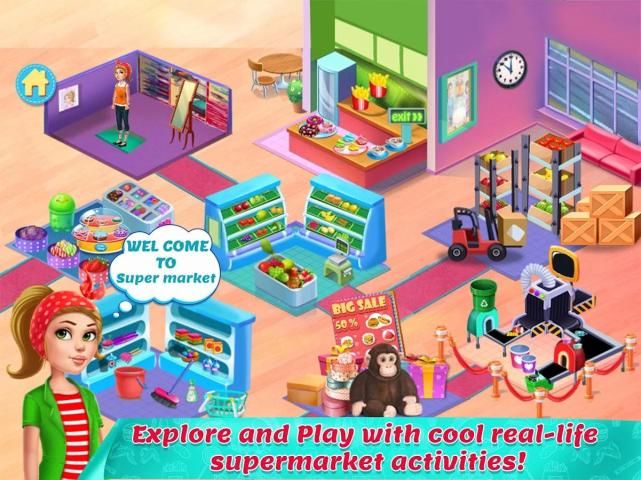 В этом местном супермаркете есть много секций: продуктовые отделения, кассовый аппарат, конфеты и десерты, кафетерий, игрушки, зона переработки и многое другое. Выполняйте все необходимые задачи и предоставляйте превосходные услуги своим клиентам.