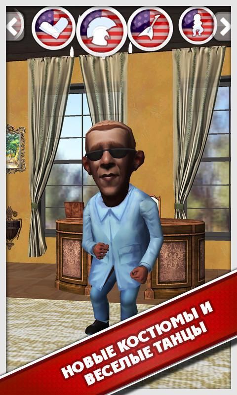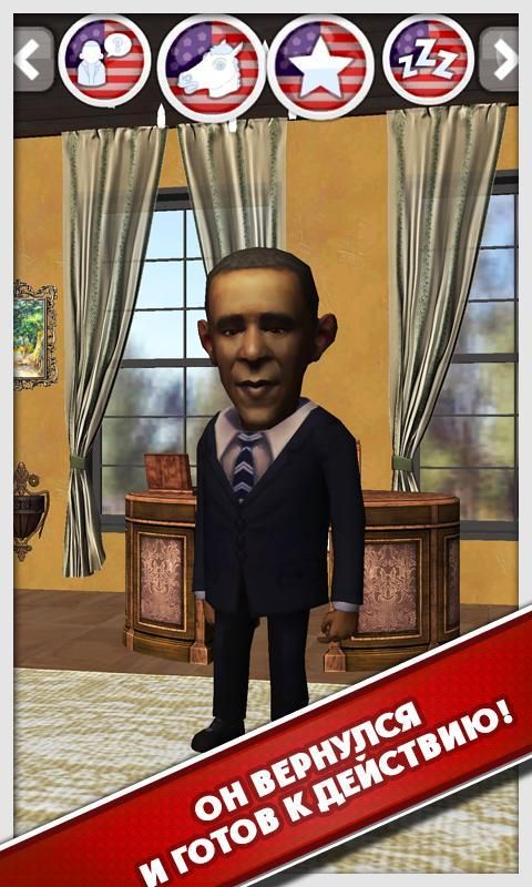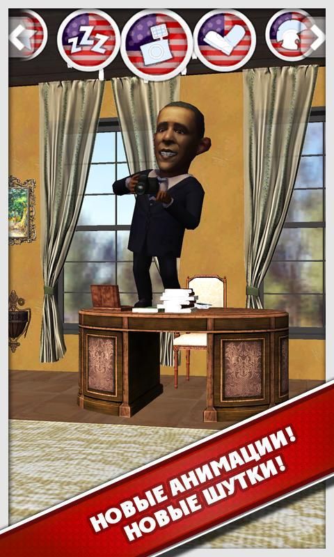 Talking Statesman Obama 2 — знаменательное возвращение полюбившихся героев на Андроид. Встречайте, собственной персоны президент США Барак Обама с потрясающим и совершенно небывалым набором шуток и юмора. Экономика на спаде? Не переживайте, сам президент США с неподдельной радостью сможет ее поднять, а если неудача, просто отойдет в сторону. Неужели Вас подслушивают? Нет уж в США это невозможно! Но не только Барак Обама порадует своим присутствием, но и много других знаменитостей, которые уже были у Вас в гостях. Не томитесь, быстрее и скорее скачайте отличную и забавную игрушку, и веселитесь.