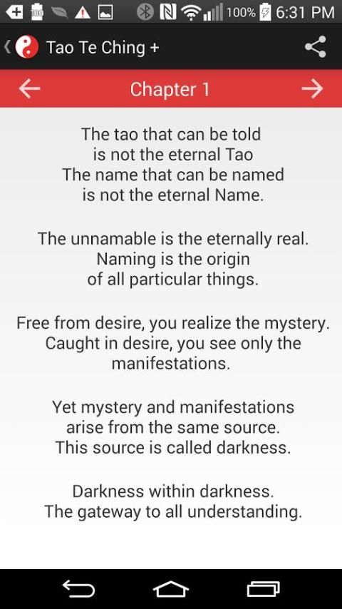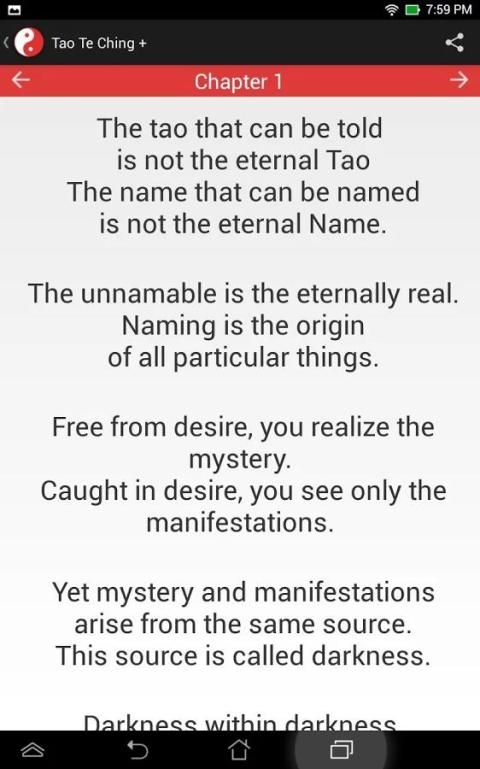 Дао Дэ Цзин широко признан как один из великих философских текстов Востока. Написанная в пятом веке до нашей эры, этот классический Лао Цзы спровоцировал интриги, мысли и конфликт в 2500 лет после его существованию. Теперь, это вневременной текст доводится до ваших пальцев с этой прекрасной цифровой исполнение. Прокрутка всех 81 стихов на досуге, на ходу на смартфоне, или дома на планшете. Дополнительные функции включают в себя возможность поделиться своей вновь обретенной мудрости с друзьями, и случайное селектор стих, чтобы насытить свой счастливое подряд.