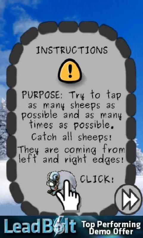 TAP SHEEP CHRISTMAS EDITION Simple and fun kids' tap a sheep christmas game where you aim to tap as many sheeps as you can and not to let lambs to disappear when they look from left & right. This is a simple arcade game, a bit of dummy as well :-). The game is similar to famous Ant Smasher but with sheeps and lambs. It is based on original Android Sheep Game which features now over 15 MILLION SHEEPS CAUGHT by the players worldwide already!! So I hope you like this simplified version and the special Christmas edition while we are now waiting for the Santa Clause to arrive and bring us many new toys and gifts.. :). Tap Sheep / Tap Lamb game features: - try to catch Santa Clause's lambs when they are looking from left and right. - use your device touch screen to tap a sheep. - catch joker lamb to gain extra points. - tap lambs as many times as you can for additional points. - beware of angry dog - it farts if you tap it. - special xmas edition features: christmas sheeps and winter background iamges, a special christmas song. This game is using advertisements and they are currently visible all the time due to technical constraints from Ads provider. Please send all feedback and comments to support@iloapps.com. Happy Sheeping! -. Game by ILOapps. Developer blog at www.iloapps.com. This game uses a fantastic cross-platform game engine library called libGdx: http://libgdx.badlogicgames.com/. Keywords: android sheep game, tap sheep, tap lamb, lamb game, funny, dummy, arcade game, tap a sheep, catch a sheep, catch a lamb, run sheep run, sheep runner, sheep capture game, christmas version, christmas special edition, x-mas, xmas sheep game, santa claus sheep game, free game, game with ads, libgdx, iloapps, ilogames, www.iloapps.com. TAP SHEEP Christmas Edition Просто и весело детские игры нажмите овец Рождества, где вы стремитесь нажмите столько овец, как вы можете и не допустить, чтобы ягнят исчезают, когда они смотрят слева и справа. Это простая аркадная игра, немного манекена также :-). Игра похожа на известный сногсшибательное муравья, но с овцами и ягнятами. Он основан на оригинальной Овцы Игры для Android, который показывает сейчас более 15 миллионов ОВЦЫ пойманы игроков по всему миру уже! Таким образом, я надеюсь, вам понравится это упрощенная версия и специальный Рождественский выпуск в то время как мы теперь ждем Деда Мороза, чтобы прийти и принесет нам много новых игрушек и подарков.. :). Нажмите Овцы / Tap функции Lamb игры: - Пытаться поймать ягнят Деда Мороза, когда они ищут от левой и правой. - Использовать устройство с сенсорным экраном задействовать овец. - Поймать Джокера ягненка чтобы получить дополнительные очки. - Нажмите ягнят столько раз, сколько вы можете для дополнительных очков. - Остерегайтесь злая собака - она пукает, если вы нажмите на него. - Специальное издание Xmas Особенности: Рождество овец и iamges зимой фон, специальные рождественские песни. Эта игра использует рекламу и они в настоящее время видны все время из-за технических ограничений от поставщика объявления. Пожалуйста, присылайте все отзывы и комментарии к support@iloapps.com. Счастливые Sheeping! -. Игра ILOapps. Разработчик блог на www.iloapps.com. Эта игра использует фантастический кросс-платформенный игровой движок библиотеки под названием libGdx: http://libgdx.badlogicgames.com/. Ключевые слова: Android игры овец, овец кран, кран ягненка, баранина игры, веселые, манекен, аркадные игры, нажмите овец, ловить овец, ловить ягненка, запустите перспективе овец, овец бегун, игра Овцы захват, Рождественская версия, Christmas Special Издание, Рождество, Рождество овцы игра, дед мороз овец игра, бесплатная игра, игра с объявлениями, libgdx, iloapps, ilogames, www.iloapps.com.