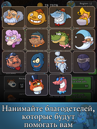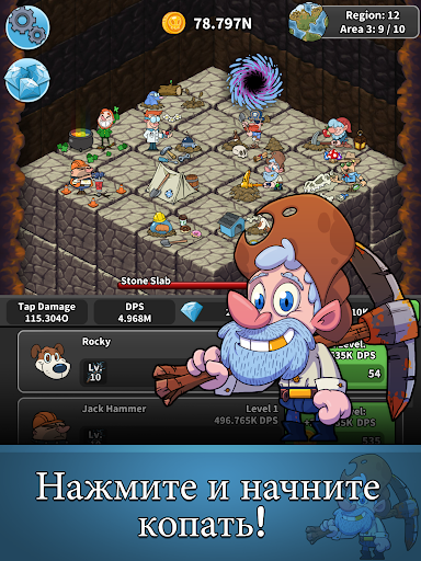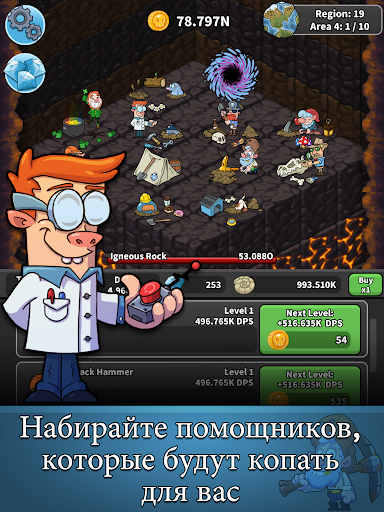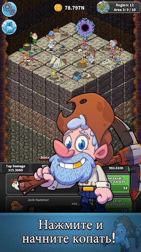 Добыча золота еще никогда не была такой интересной! Сначала просто жмите по экрану, а затем повышайте уровень помощников и нанимайте благодетелей, которые будут помогать вам копать глубже и быстрее. Открывайте пирата, строительного слизняка, миниатюрную черную дыру и других помощников! Все еще считаете себя недостаточно сильным? Собирайте окаменелости и запускайте Большой взрыв для еще большего повышения эффективности добычи!