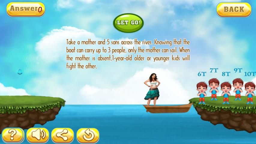 Улучшение вашего мозга с реки Iq пересечения логики test..This игра очень интересна для вас. Есть много игровой логический уровень IQ. каждый уровень хороший вопрос. Примеры: "Помощь семейство 5 peole двигаться через реку на лодке, и лодка способна максимум 2-х человек, перевозящих capacity.Time для путешествий каждого человека, в свою очередь 1S, 3S, 6S, 8S и 12S Если. два человека оба идут на лодке, лодка будет двигаться со скоростью более медленного человека. в 30-е годы возьмите с собой всю семью через реку ".