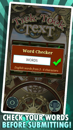 An addictive new steampunk styled word game for the android.Last Castle Games presents its debut title, TickTockText Beat your best scores, unlock achievements, or compete against other players on the online leaderboards. Featuring 4 unique game play modes with varying levels of difficulty, this game is both fun and challengingAdsupported version please let me know if ad frequency is too much : Gameplay requires English LanguageFeatures:4 unique modesFun and addictive gameplayEyecatching graphics32 Unlockable AchievementsOnline and Local ScoresPractice ModesGame modes:Classic:The clock is ticking, as you race to form as many words as possible.Be sure to grab bonuses and time extensions to help you along the wayDynamite:See how many rounds you can last before the bomb goes off Select letter tiles to fill in the missing spaces to form words in a race against time.Puzzle Box:How long it will take you to solve the puzzle? Swap letter tiles around to form words in this challenging mode.Bubble:Chain together bubbles to form words. Used bubbles pop while those lower float upwards. Words formed from samecolored bubbles award bonus points