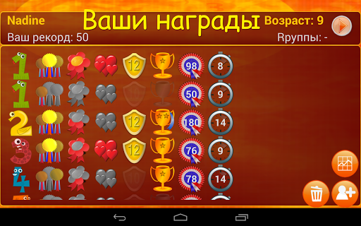 «Ваши награды» и конечно побить рекорд мамы или отца - это круто! В игре есть новая функция, которая показывает мировой, широкий перечень рекордов. Дети во всем мире практикуют таблицу умножения вместе с этим приложением. Можете ли вы победить их рекорды? Мы добавили возможность изучать любую таблицу умножения до 12x. Это дополнительный вызов, за который вы будите награждены новым значком достижения . Проверьте вместе с детьми насколько хорошо вы знаете таблицу умножения.