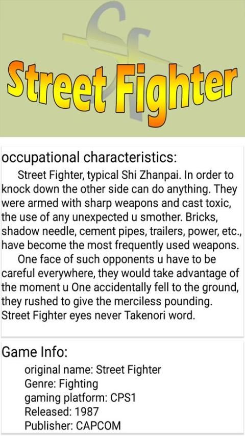 Street Fighter из Японии компании CAPCOM в 1987 году впервые введена автономная файтинг серии, первое поколение игр, выпущенных 30 августа 1987.The Сюжет вращается вокруг серии Street Fighter со всего мира, чтобы принять участие в "Всемирной конференции борьба с «уличных солдат расширяться.