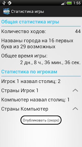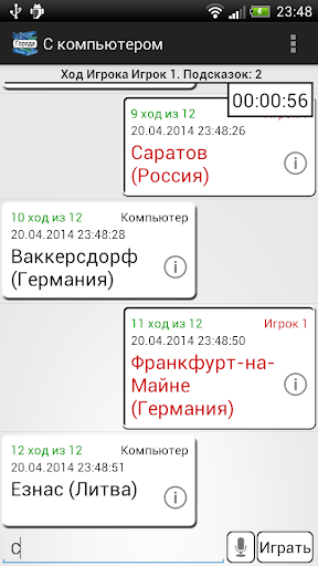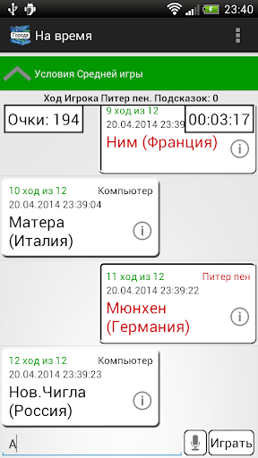 - Режим игры. Вы хотите поиграть в "Города", но никто не разделяет ваше желание? В режиме игры у вас есть возможность попробовать обыграть компьютер, что не так уж невозможно. Так же есть режим игры на время. Покажите свои знания в ограниченном времени. Зарабатывайте очки, станьте первым.