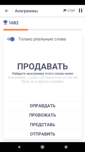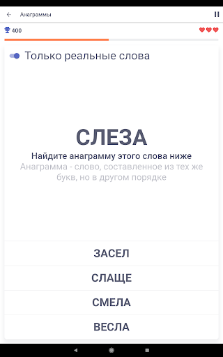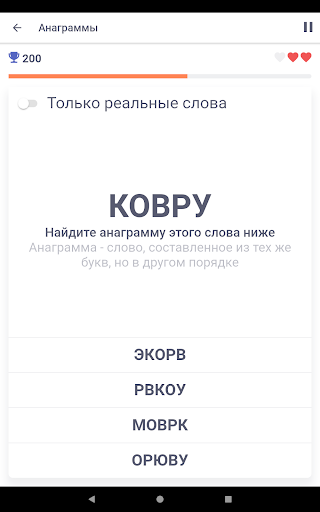 - "Анаграммы" - улучшают внимание и скорость реакции. В этой игре вам нужно найти анаграммы определенных слов (Анаграмма - слово, составленное из тех же букв, но в другом порядке)
