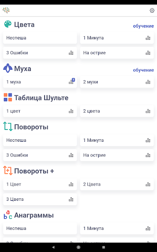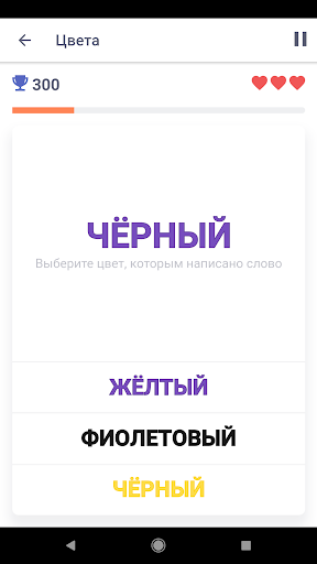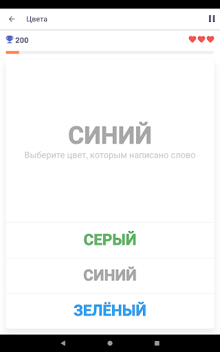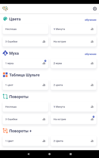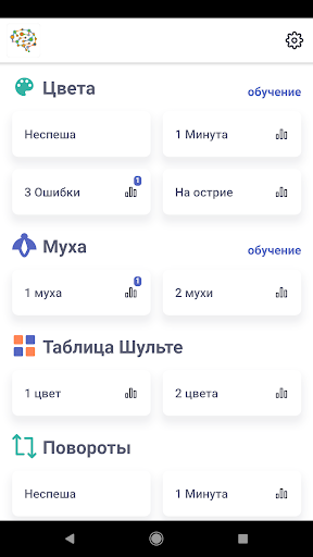 - "Цвета" - основана на эффекте Струпа (задержка реакции при прочтении слов, когда цвет слов не совпадает с написанными словами). Эта игра улучшат внимание и скорость реакции.
