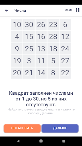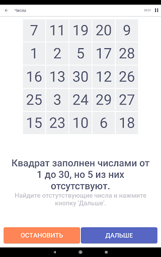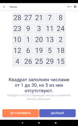 - “Числа” - тренирует внимание и память. В этой игре вам нужно найти отсутствующие числа в таблице как можно быстрее.