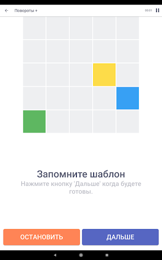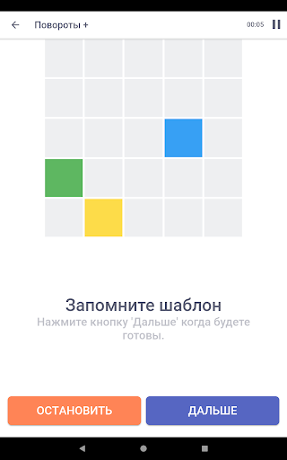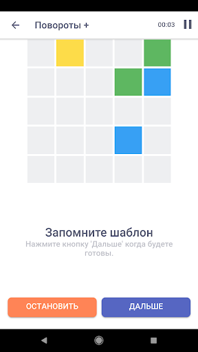 - "Повороты " - тренирует пространственное мышление и способствует улучшению памяти. Начните с режима ‘1 цвет’ и уровня ’Очень легко’ чтобы лучше понять задание и потренироваться. Затем выбирайте более сложные уровни чтобы тренировать пространственное мышление и память еще эффективнее.