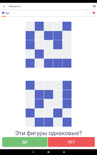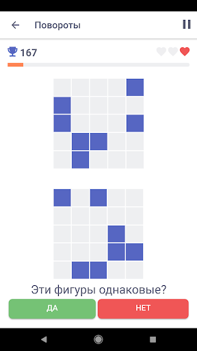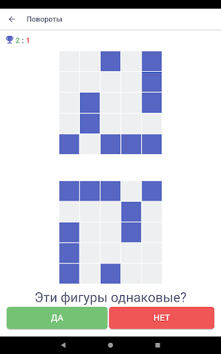 - "Повороты" - тренирует пространственное мышление. Здесь вам нужно сравнить два шаблона и решить одинаковы ли они (будут ли они совпадать после поворота на 90, 180 или 270 градусов).
