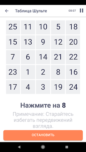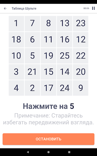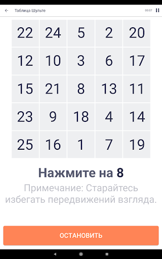 В режиме “1 цвет” игры “Таблица Шульте” вам нужно находить все числа таблицы в порядке возрастания. Например для таблицы 5х5 вам нужно будет найти следующие числа: 1, 2, 3, …, 24, 25.
