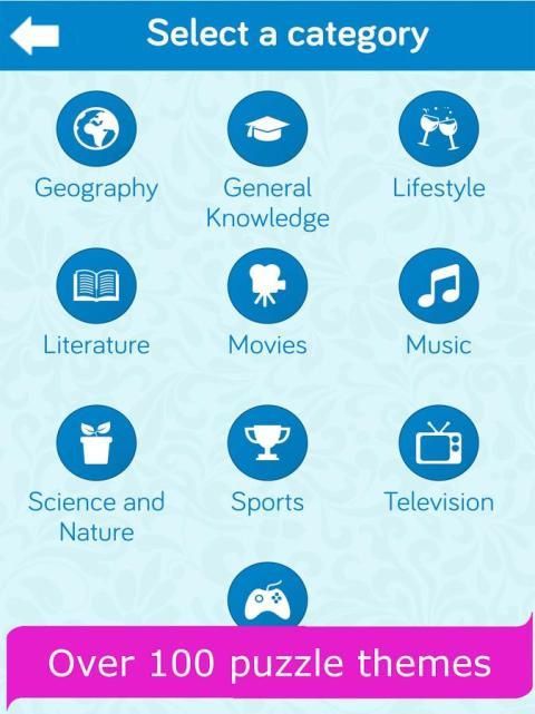 Выберите из категорий головоломки в том числе географии, Общие знания, Образ жизни, Литература, Фильмы, Музыка, Наука и природы, спорта, телевидения и Игры и игрушки.