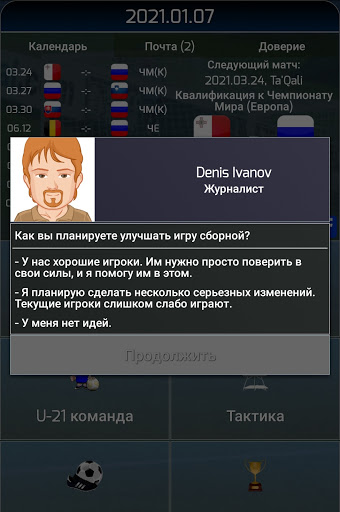 - Интервью с журналистами, звонки с ваших игроков - каждый ваш ответ влияет на их моральное и других параметров. Будьте осторожны, что сказать!
