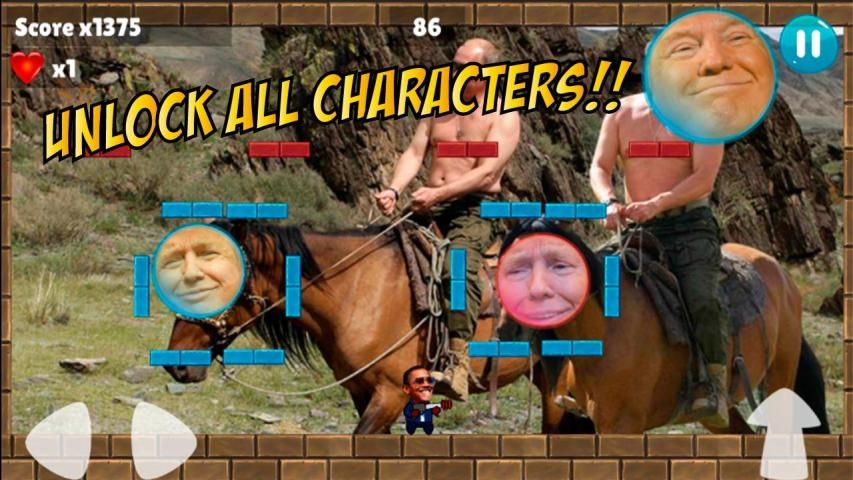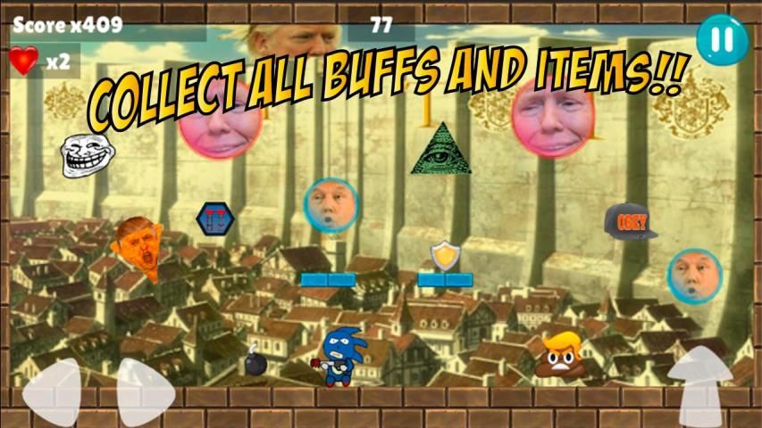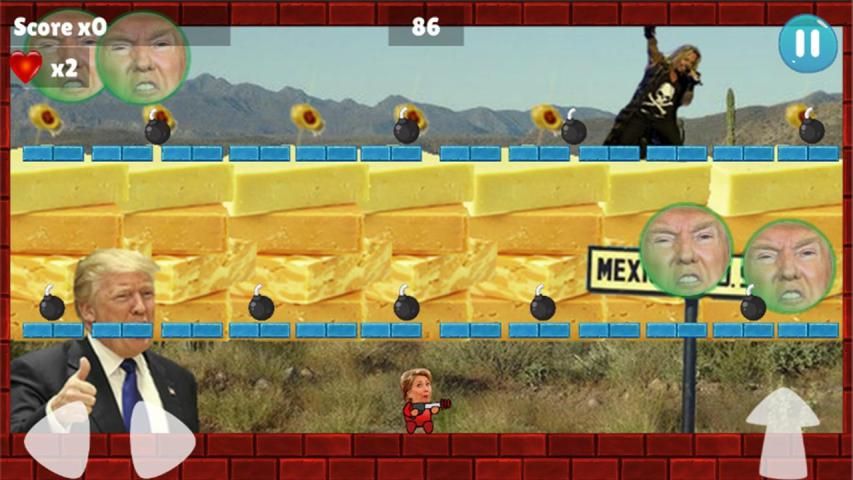 40 свободных и веселых уровней, где г-н президент Rump пытается строить свою стену, удар козырной выбрать оружие, привлекает гарпуны и сделать Америку большой снова.