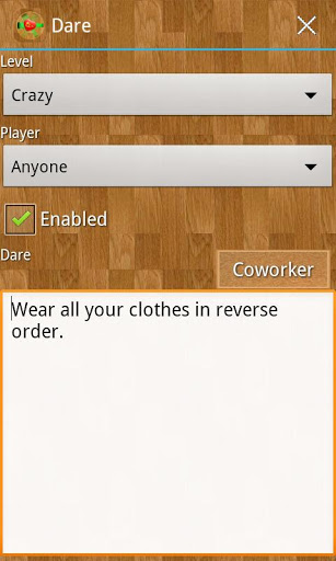 Adult version of Truth or Dare game. This is an extension of Truth or Dare Game Teens application. It contains around 1000 tasks, more than 500 predefined tasks with no sexual content and more than 400 tasks with adult content. It is fully customizable, you can add, modify, delete, organize the questions as you like. Main features: 2 play modes: spin the bottle, clockwise sequential order; 3 level advance mode: progressive, manual or random; random select coworkers or spin the bottle; players profile photos; players score view; questions organized in levels; fully customizable levels: add edit delete enable disable order; fully customizable questions: add edit delete enable disable; customizable playing mode;Have fun
