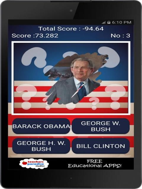 В игре представлено несколько американских президентов викторины. Короткие викторины, чтобы держать весь обучения семьи о США президентской истории.