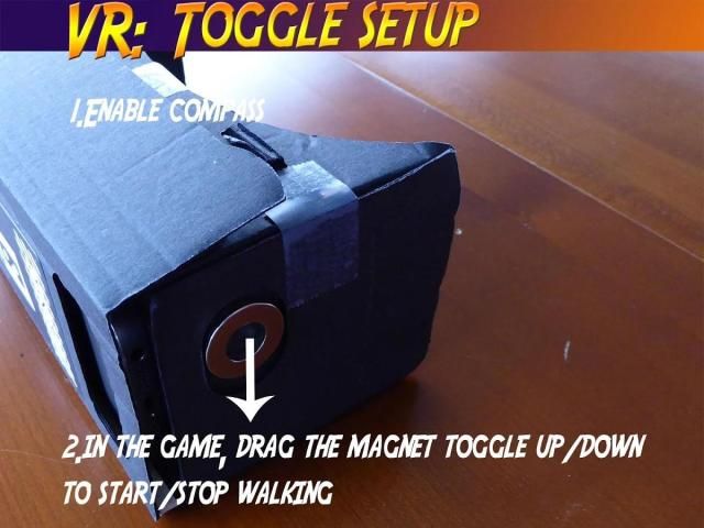 Посмотрите вниз в течение нескольких секунд или использовать Android полностью поддерживаемый магнит переключатель на боковой стороне гарнитуры, чтобы начать / остановить движение в текущей сцене или загрузить следующий уровень (4 конфигурируемых движущиеся режимы VR теперь можно с указанием или без магнита переключатель, скорость, Высота или глаз расстояние игрока также настраивается).