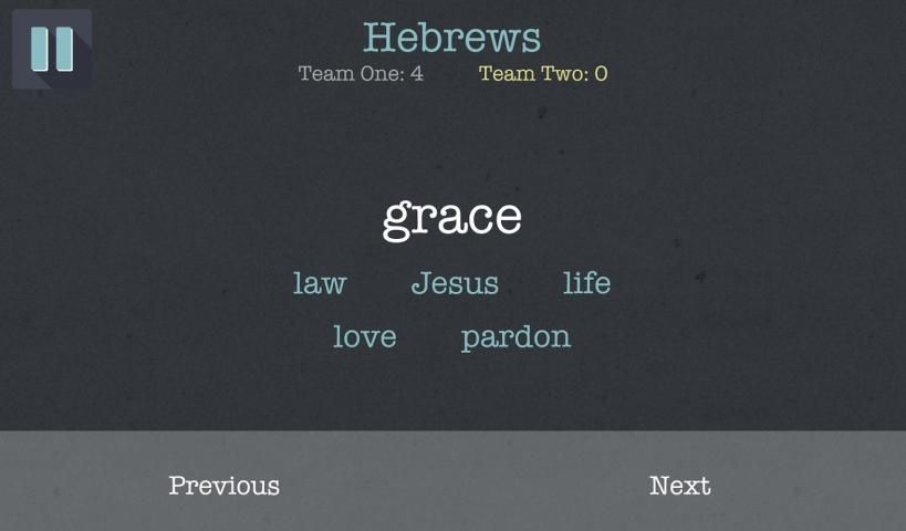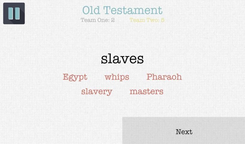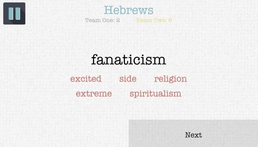 Принесите вашу семью и друзей вместе в течение нескольких часов удовольствия от этой быстро развивающейся мелочи игры. Все возрасты будут наслаждаться ускорение через категорий, таких как Ветхого и Нового Завета, Титулы сообщения, Тихие омуты, и многое другое! Все, что вам нужно, это ваш телефон или планшет, и два или более игроков, желающих догадаться из тысяч слов и фраз, взятых прямо из Библии и Послания брат Уильям Бранхам.
