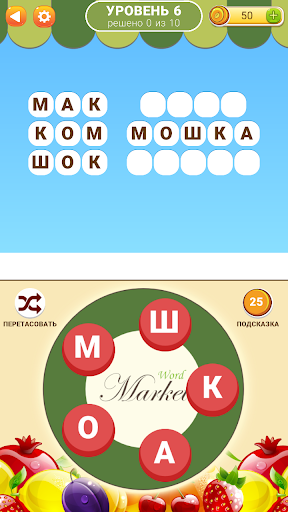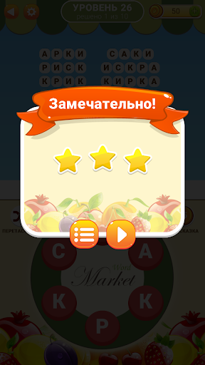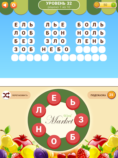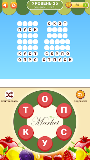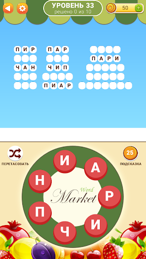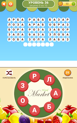 Совершенно новый набор слов в продолжении популярной игры Рынок слов. Теперь можно также превратить скрытые слова в дополнительные монеты. Проведите пальцем по буквам на тарелке, чтобы сформировать слово. За каждое отгаданне слово - сочный фрукт! Эта игра - витамины для мозгов.