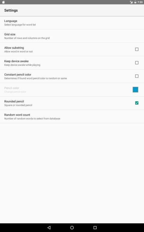 Многие параметры, такие как язык, размер сетки, позволяют подстроку, держать устройство бодрствования, постоянный или динамический цвет карандаша, округлую карандаш, случайное количество слов.