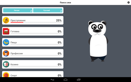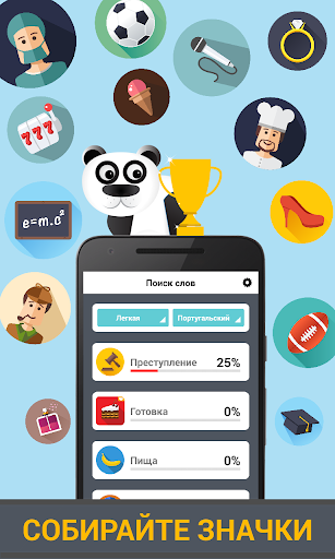 Охота на слова только что началась. Проведите по всем скрытым словам и разблокируйте на каждом уровне красивый значок. Игра доступна на 7 языках: английский (Word Search Panda), португальский (Caça palavras Panda),