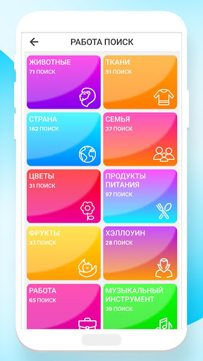 -> 15 категорий головоломок, таких как животные, одежда, страна, семья, цветы, еда, фрукты, Хэллоуин, работа, музыкальный инструмент, спорт, инструменты, транспорт, овощи, погода.