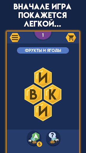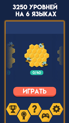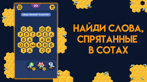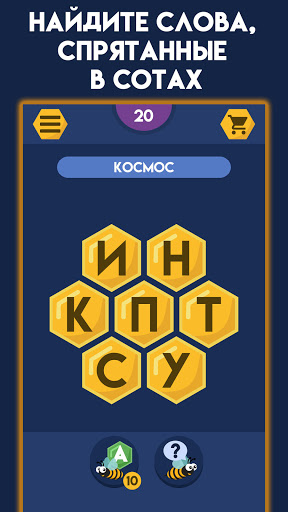 Вам предстоит поиск загаданных слов, спрятанных на игровом поле. Словесная игра сделана в пчелиной стилистике, а игровое поле с буквами напоминает соты из пчелиного улья.
