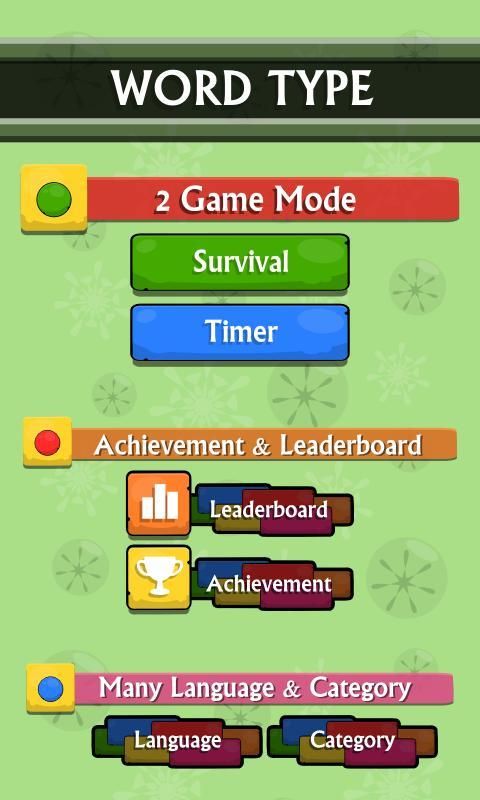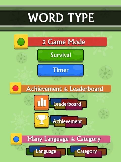 Вы можете играть в эту увлекательную игру слов на английском или индонезийский. Мы называем эту игру "Кетик Kata" на индонезийском языке. Есть также несколько категорий вы можете выбрать, например, как животные, продукты питания, Stuff, или вы можете просто выбрать все категории слова, где мы представим вам любое слово из каждой категории в случайном порядке. Тип Слово отличается от других словарных игр; Вы можете открыть для себя новые слова через нашу набрав игры и выяснить смысл из интернет-словаря.