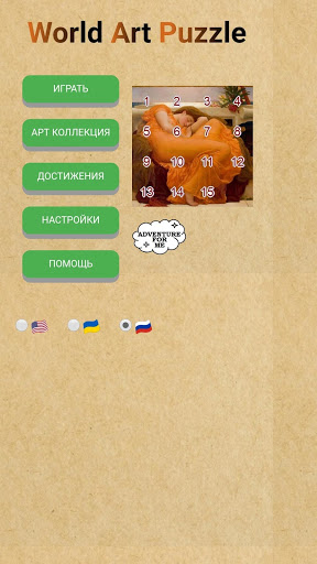 World Art Puzzle - это разновидность классической игры в 15 ("пятнашки"), которая состоит из картины разделенной на пронумерованные квадратные пластинки, расположенные в случайном порядке с отсутствием одной пластинки.